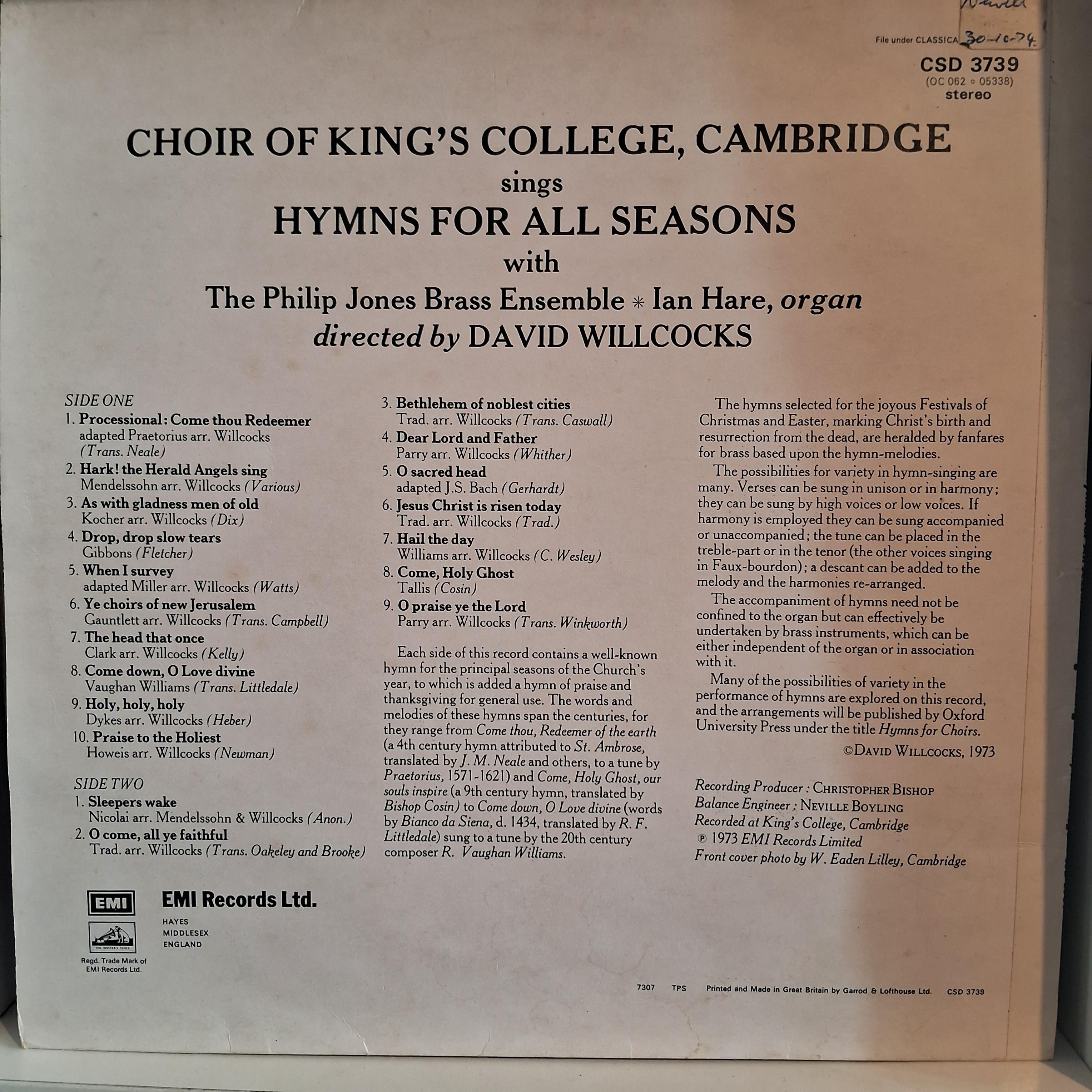 KING COLLAGE CHOIR, CAMBRIDGE * HYMNS FOR FOR ALL SEASONS